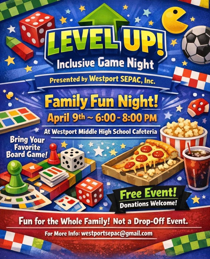 Bring your family and a favorite board game and join us for a free night of fun on April 9th from 6:00pm-8:00pm at the Westport Middle High School Cafeteria.